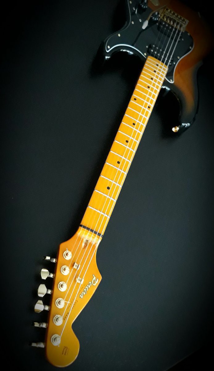 He knew he wanted a two-tone sunburst classic ash body. But for the neck, he wanted something different: a left-handed maple neck with a vintage tint gloss finish. He modified the nut to create a reverse headstock neck, which he decorated with a custom decal.