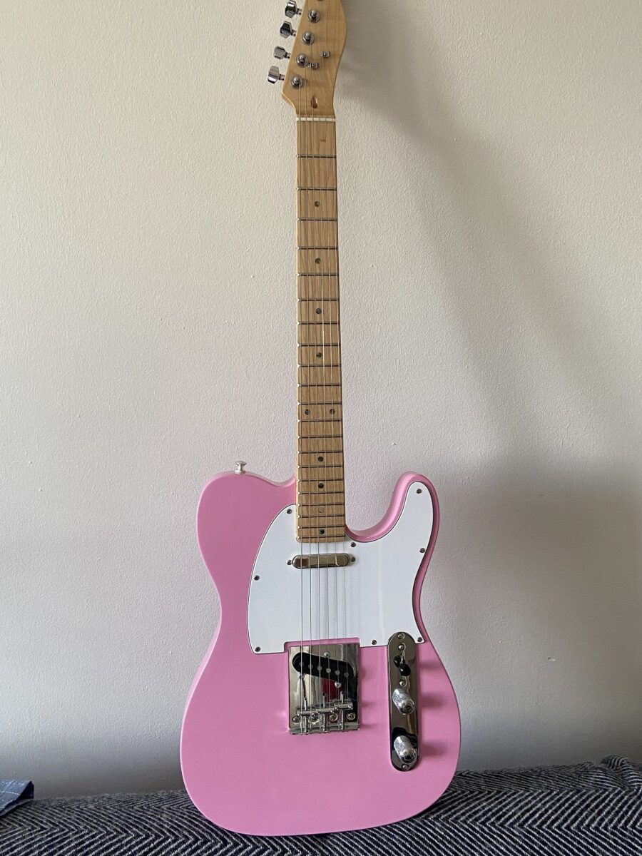 Roy Davies from the UK sent us the result of his new Telecaster, built with one of our pink basswood Telecaster bodies and completed with a maple neck with a clear gloss maple fretboard, a three-ply white pickguard, a classic three-saddle Telecaster bridge, and chrome hardware. You can see the result for yourselves.