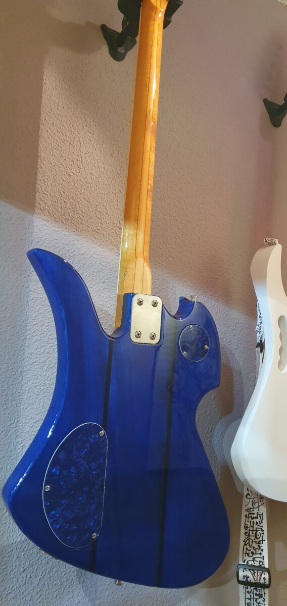 The electronics, pickup rings, knobs, etc. are also Clandestine. It has the original Tokai TWB20 hot rail pickup (from a guitar) and a set of Billy Sheehan’s signature Dimarzio DP146 Will Power pickups. The neck, tuning pegs, bridge, and tailpiece are original.”