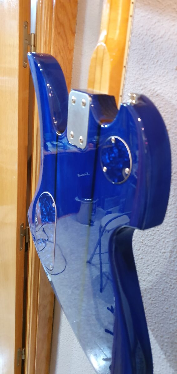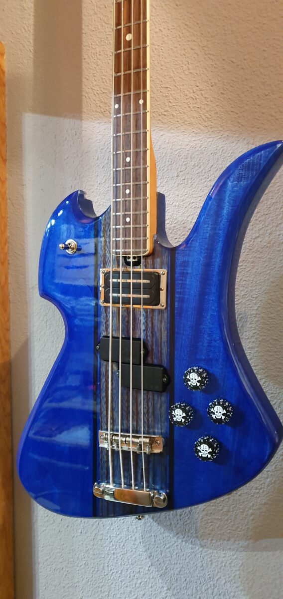 The body is your Clandestine Guitars Mockingbird basswood guitar body. Since the pickup cavities weren’t suitable for the bass, I routed the entire center section and inlaid a piece of zebrawood along with the thin rosewood strips you see next to it. This allowed me to re-route the cavities for the pickups I installed. Afterward, I gave it a French polish finish with blue stain, three coats of wood sealer with sanding in between, and a four-coat polyurethane gloss lacquer finish.