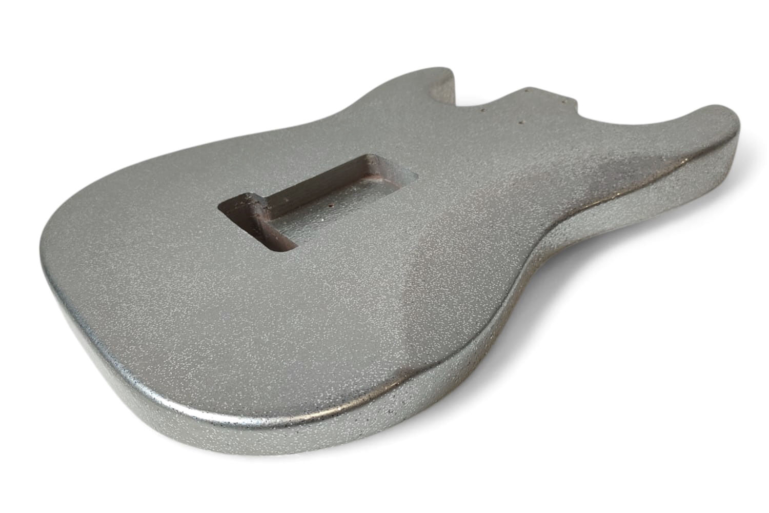 Cuerpo de guitarra eléctrica estilo Stratocaster de madera de fresno en color plateado con brillos grandes silver sparkle. Este tipo de acabado puede presentar una superficie ligeramente irregular, tipo piel de naranja.