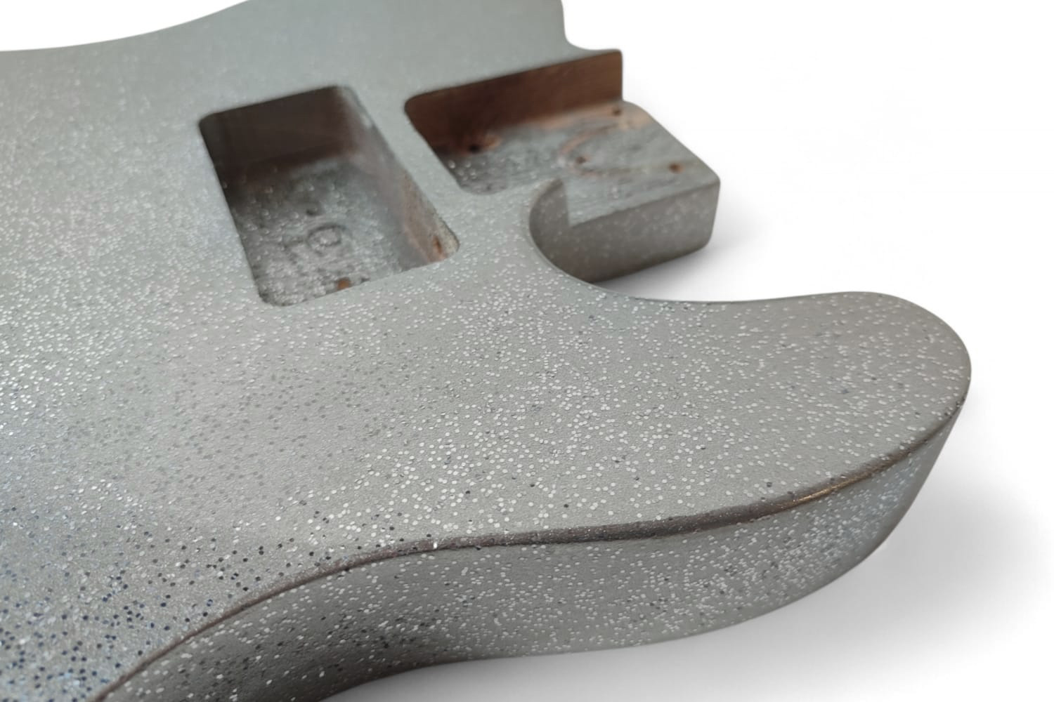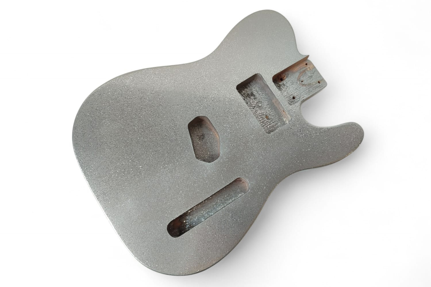 Cuerpo de guitarra eléctrica estilo Telecaster de madera de fresno acabado en color plateado con brillos grandes silver sparkle. Este tipo de acabado puede presentar una superficie ligeramente irregular, tipo piel de naranja.